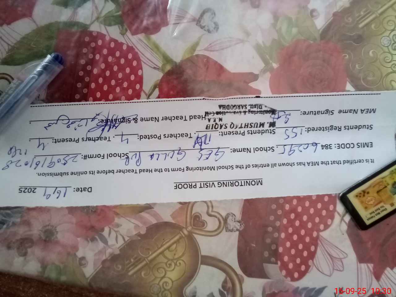 | Name: MO**** MU**** Designation: (School Headmaster's/Headmistress's) PST Phone/Cell Number: 03**** |