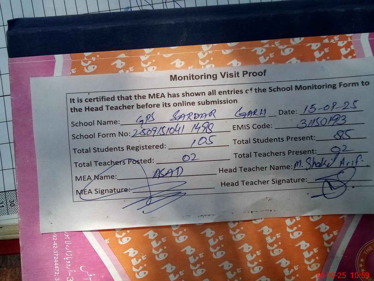 | Attendance Register | Head Teacher | MEA with School | Visit Proof |