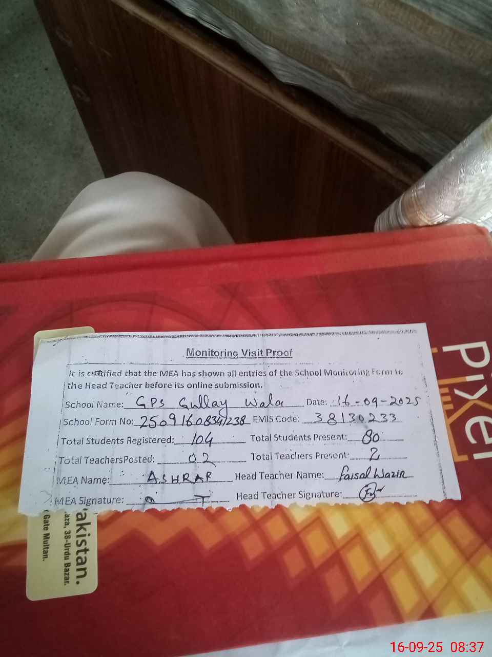 | EMIS Code: 38130233 | Name of School: GPS GULLAY WALA | |||