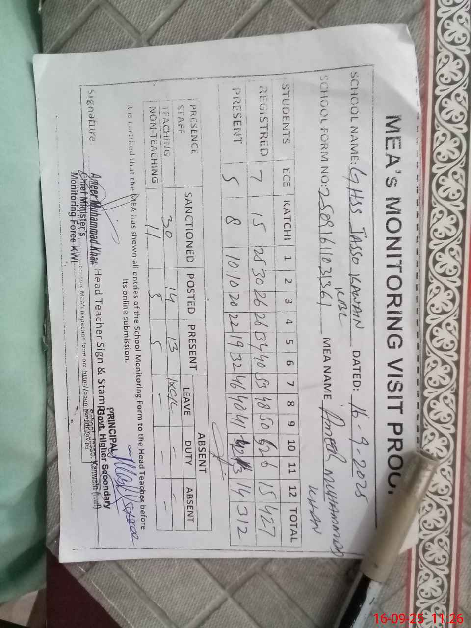 | Attendance Register | Head Teacher | MEA with School | Visit Proof |