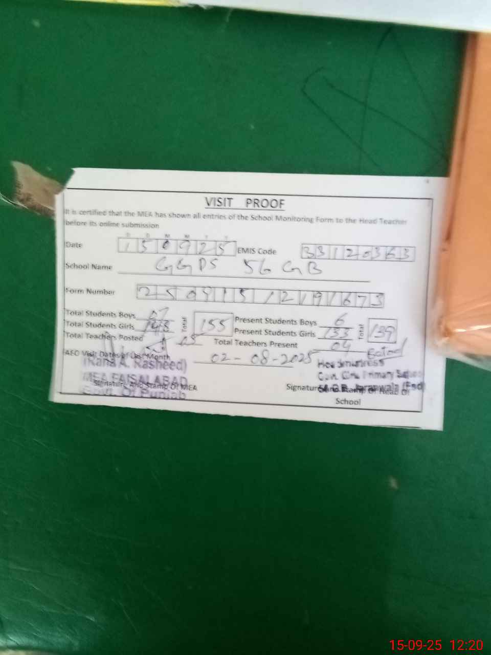 | Attendance Register | Head Teacher | MEA with School | Visit Proof |