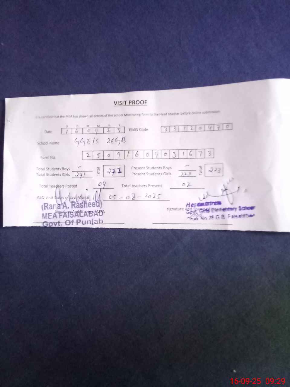 | Attendance Register | Head Teacher | MEA with School | Visit Proof |