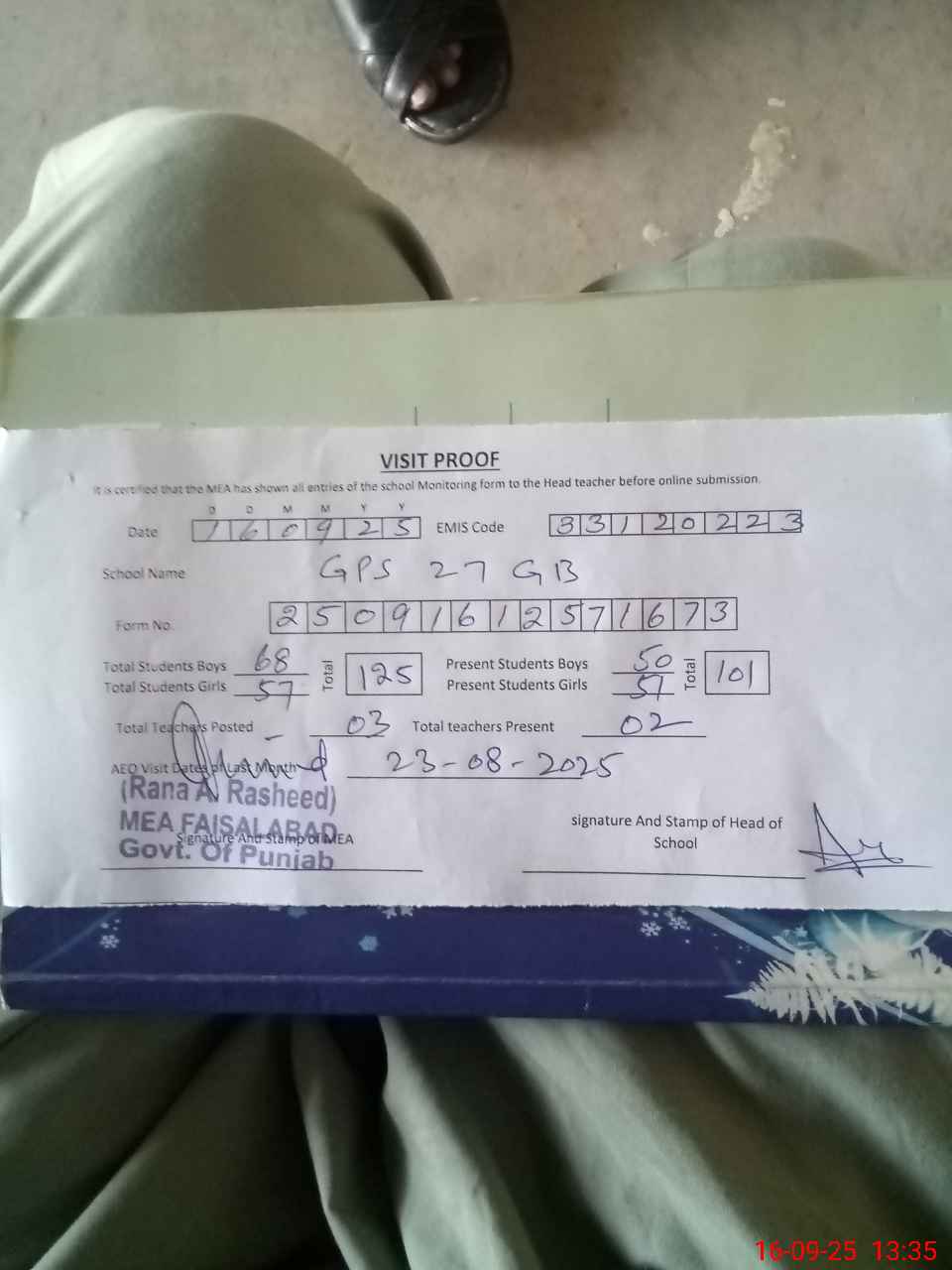 | Attendance Register | Head Teacher | MEA with School | Visit Proof |