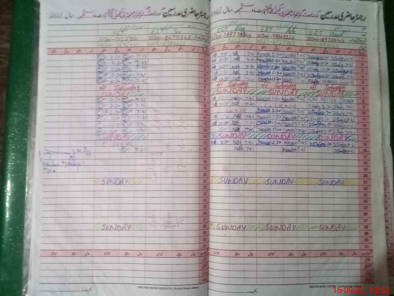 | CNIC | Full Name | Designation | R/C | Absence During Last Calender Month |