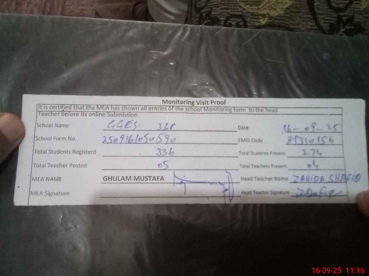 | Attendance Register | Head Teacher | MEA with School | Visit Proof |
