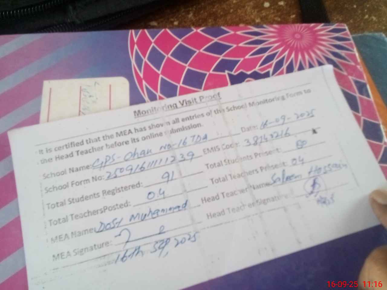 | Attendance Register | Head Teacher | MEA with School | Visit Proof |