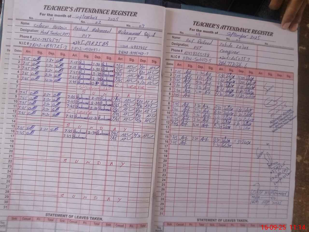 | CNIC | Full Name | Designation | R/C | Absence during last cal. month |