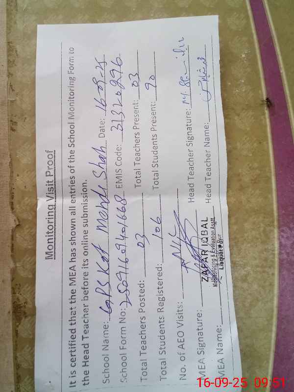 | EMIS Code: 31320296 | Name of School: GPS KOT MEHDI SHAH | |||