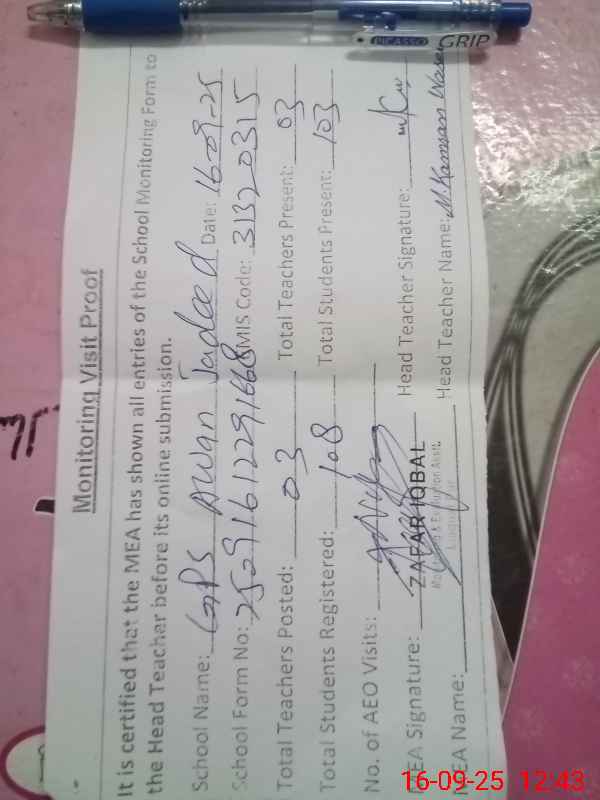 | Attendance Register | Head Teacher | MEA with School | Visit Proof |