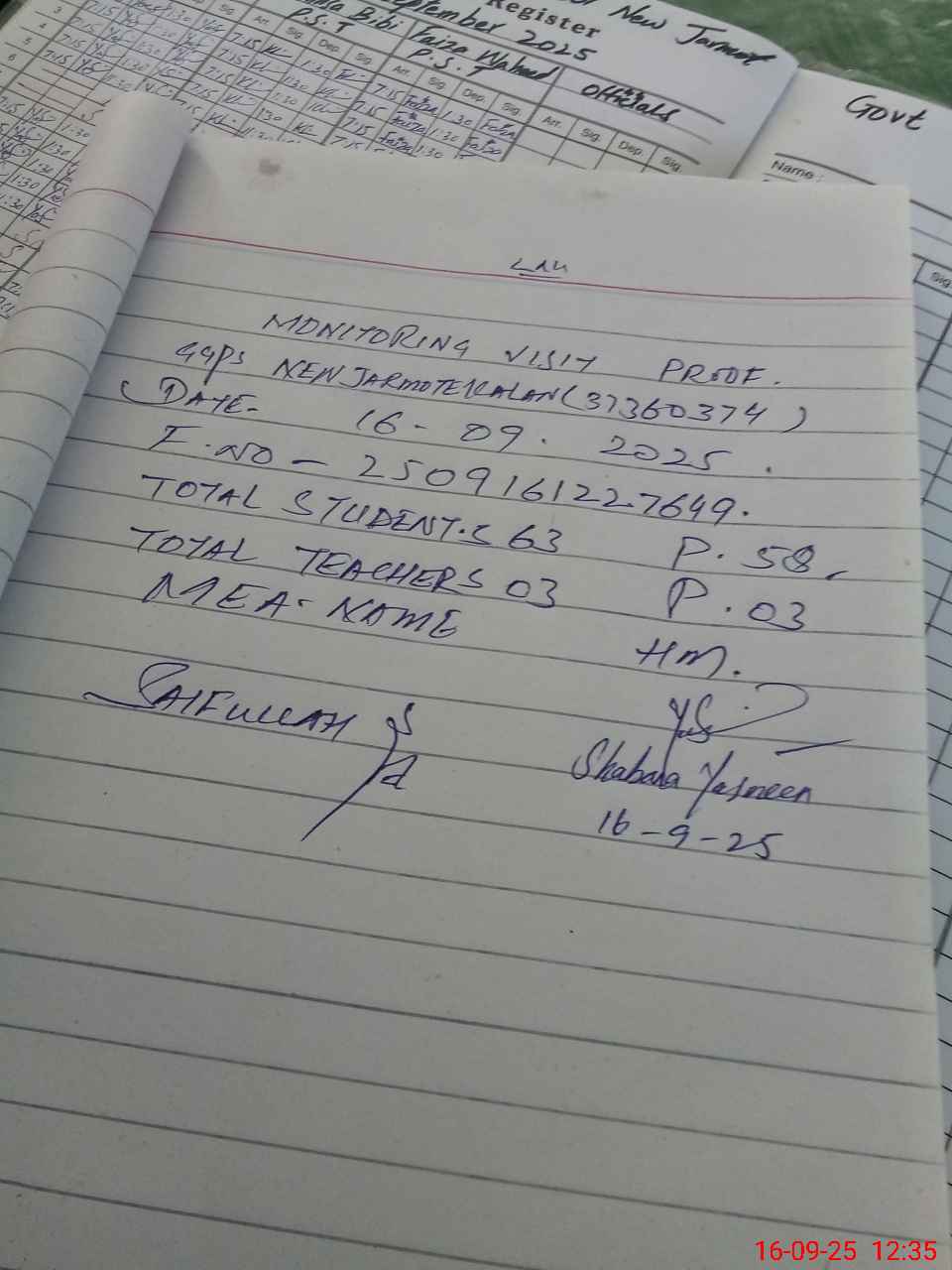 | Attendance Register | Head Teacher | MEA with School | Visit Proof |