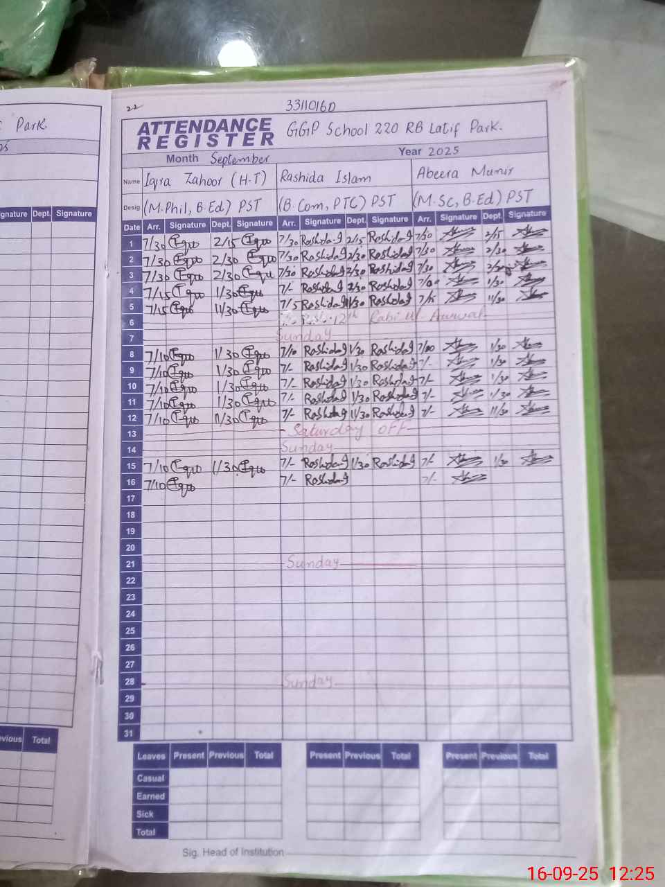 | CNIC | Full Name | Designation | R/C | Absence During Last Calender Month |