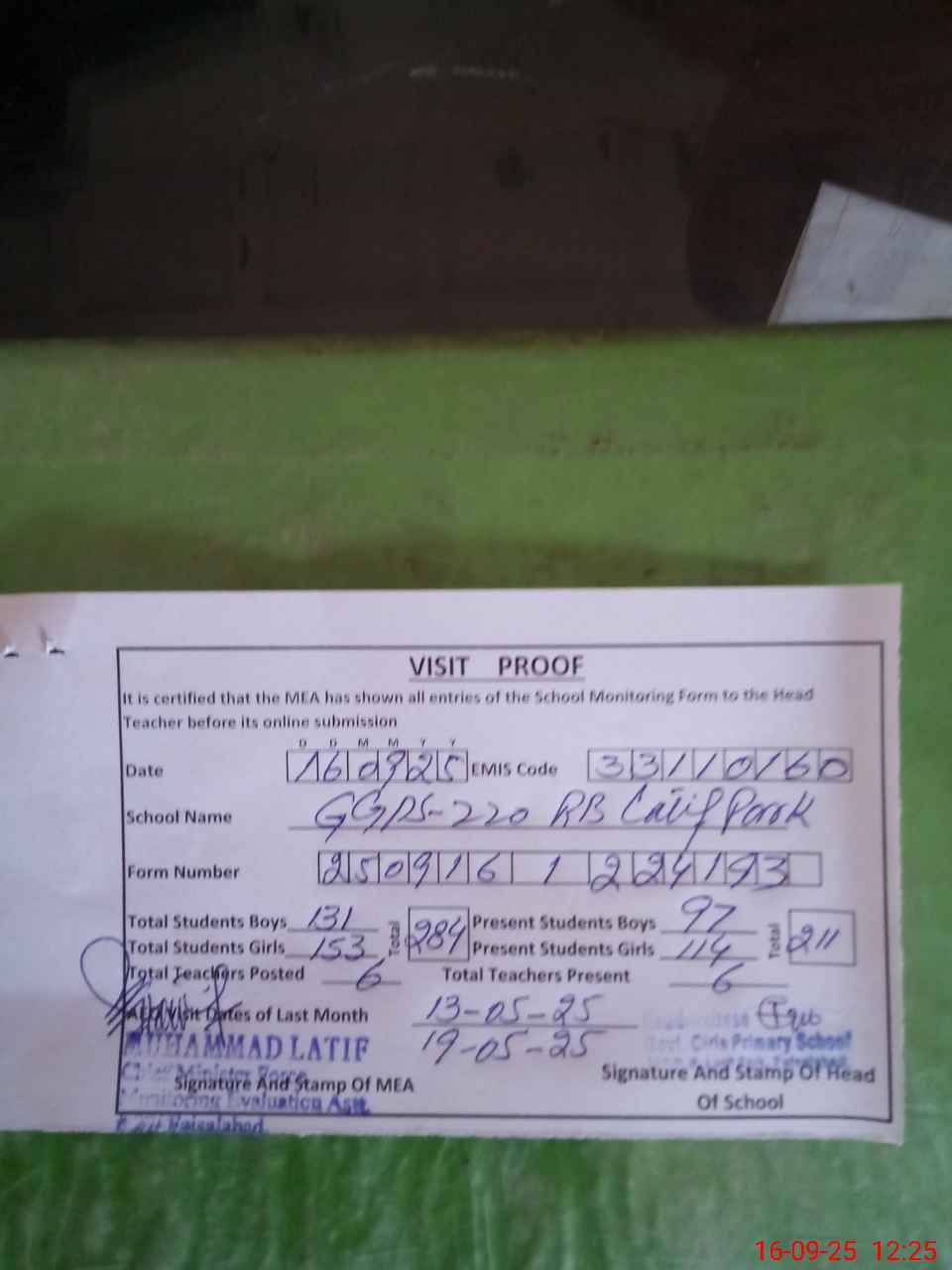 | Attendance Register | Head Teacher | MEA with School | Visit Proof |