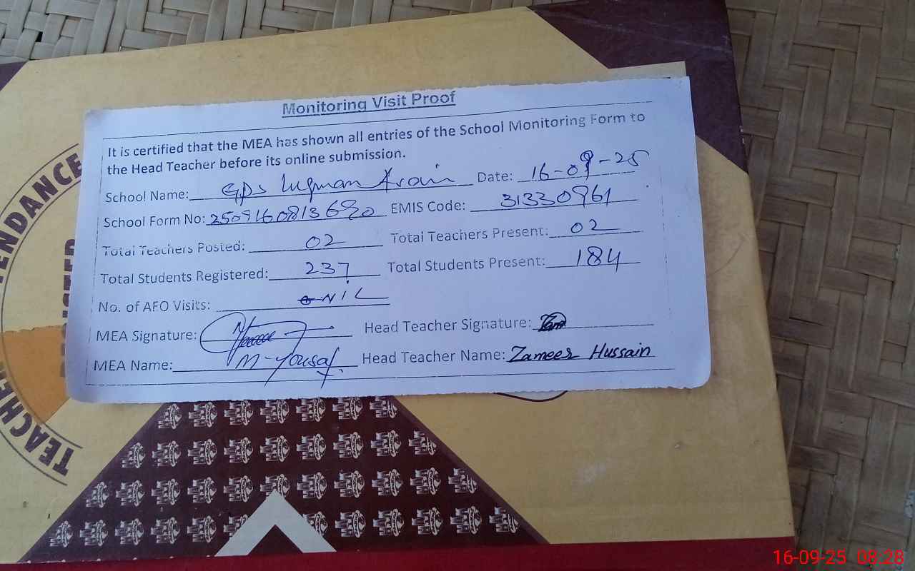 | EMIS Code: 31330961 | Name of School: GPS LUQMAN ARAIN | |||