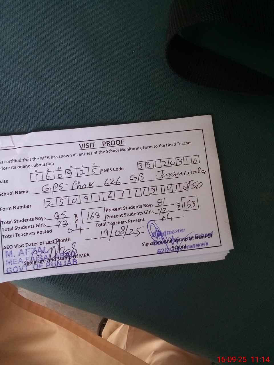 | Attendance Register | Head Teacher | MEA with School | Visit Proof |