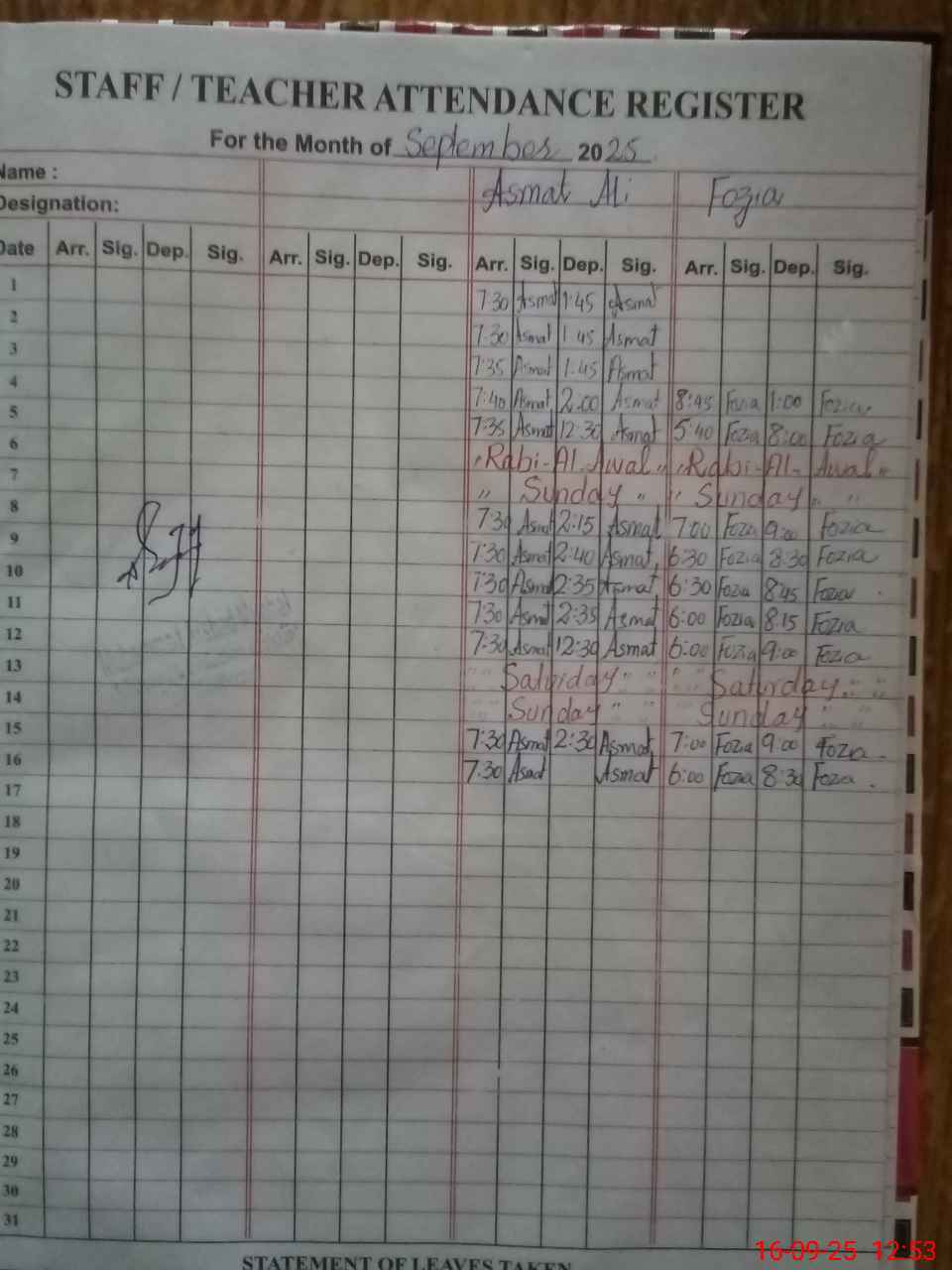 | CNIC | Full Name | Designation | R/C | Absence During Last Calender Month |