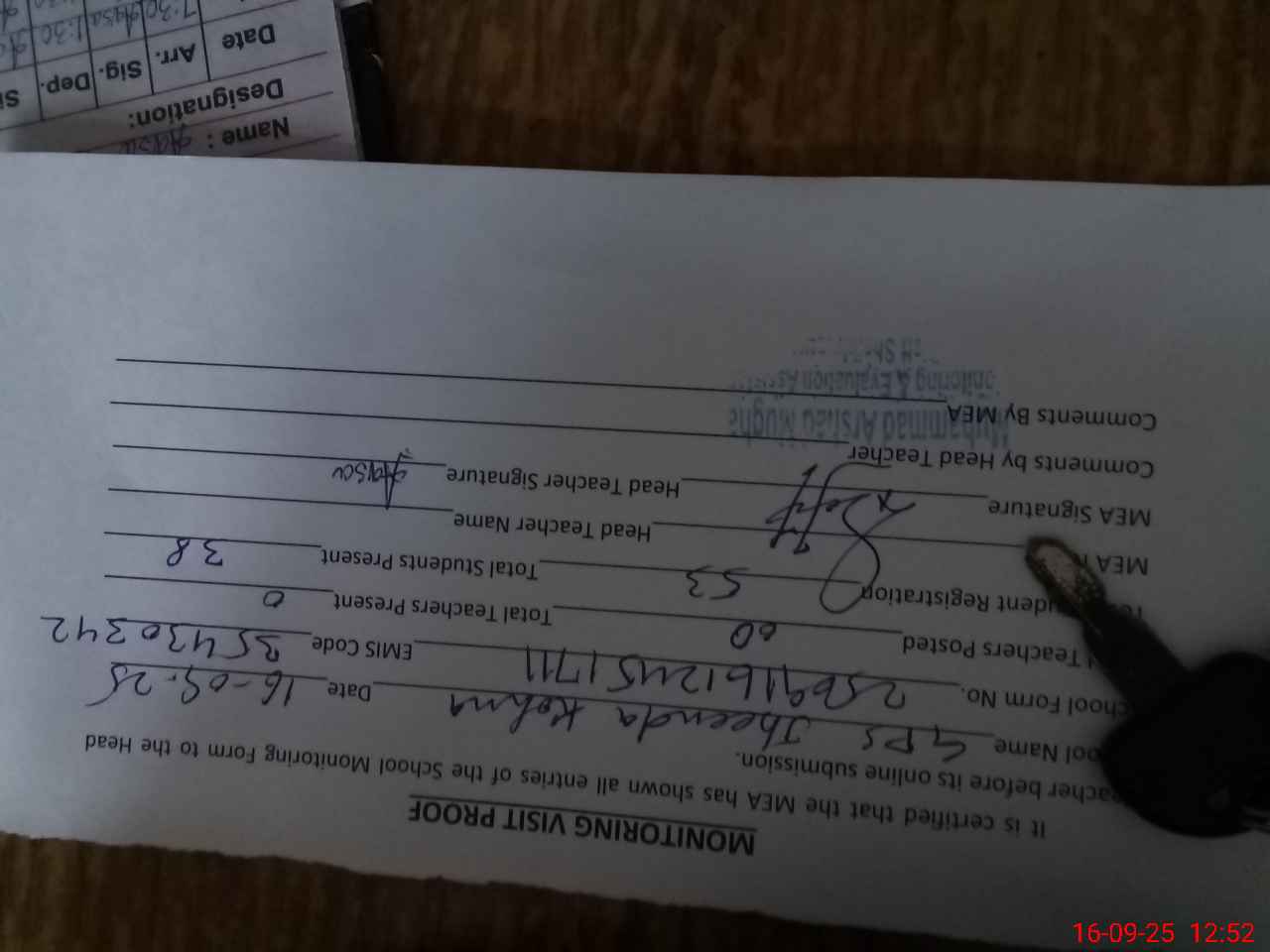 | Attendance Register | Head Teacher | MEA with School | Visit Proof |