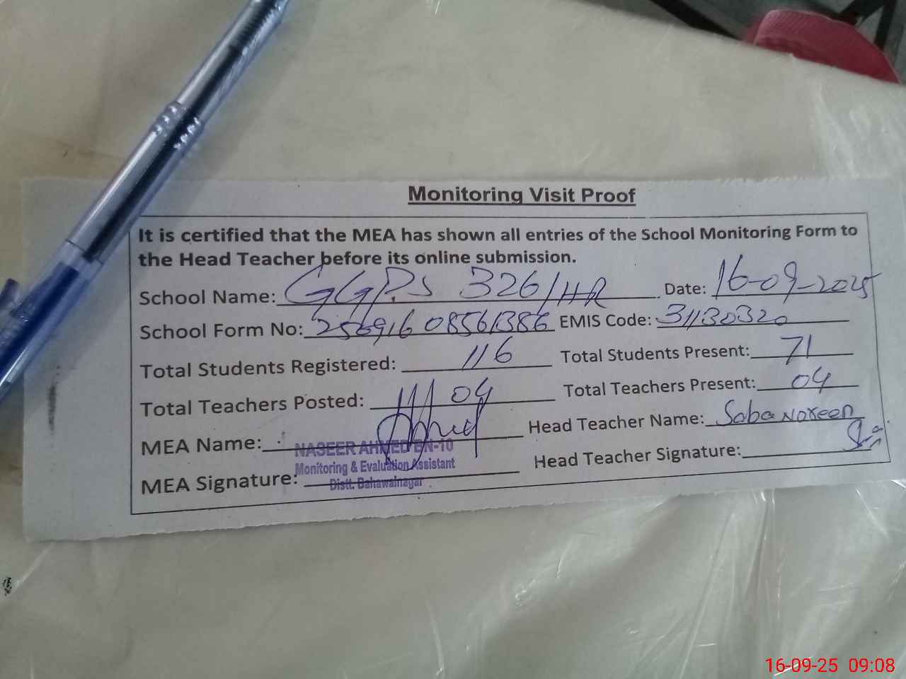 | Attendance Register | Head Teacher | MEA with School | Visit Proof |