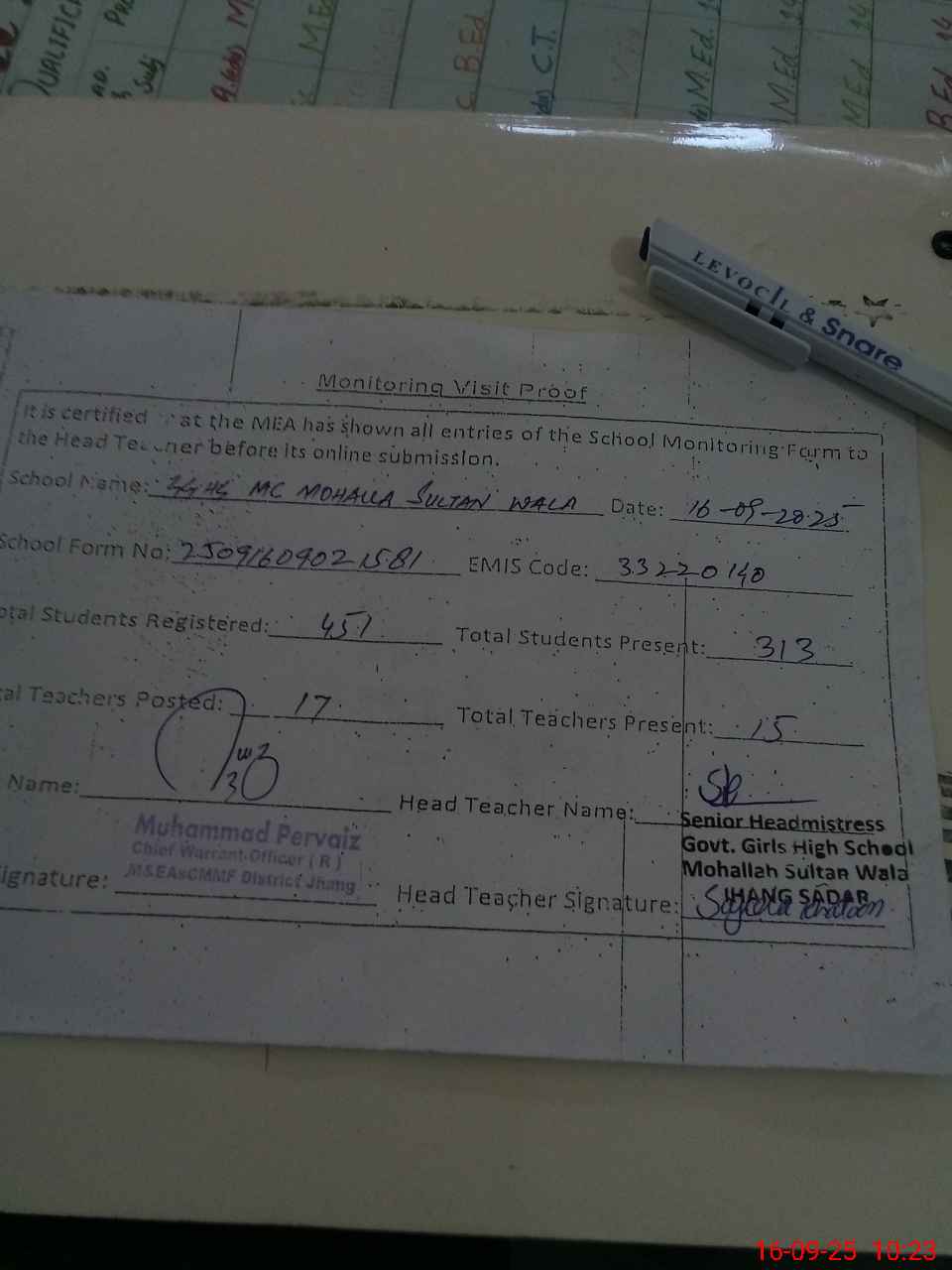 | Attendance Register | Head Teacher | MEA with School | Visit Proof |