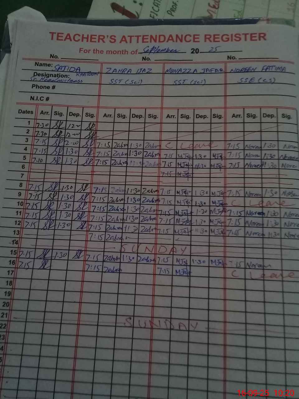 | CNIC | Full Name | Designation | R/C | Absence During Last Calender Month |