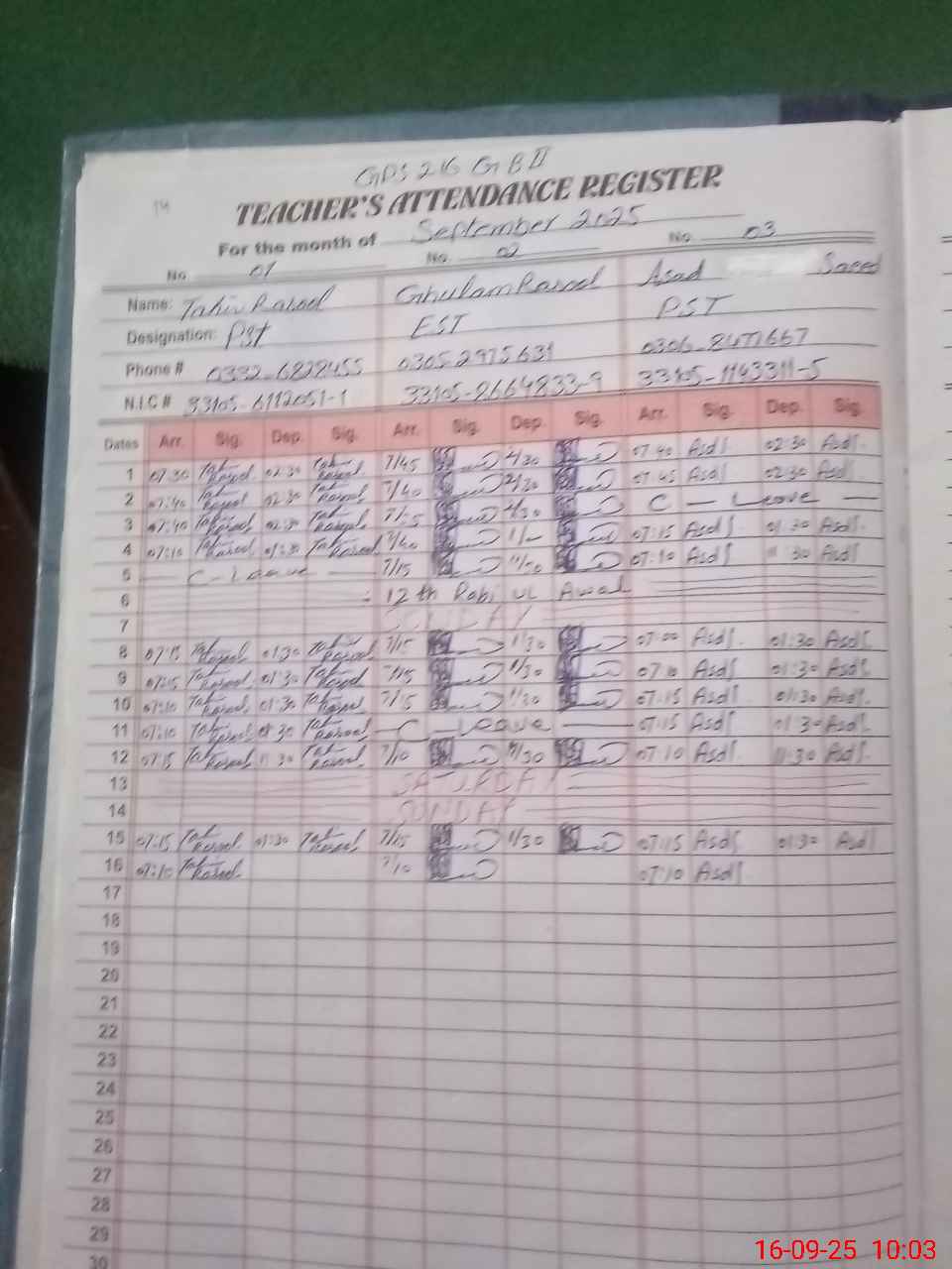 | CNIC | Full Name | Designation | R/C | Absence during last cal. month |