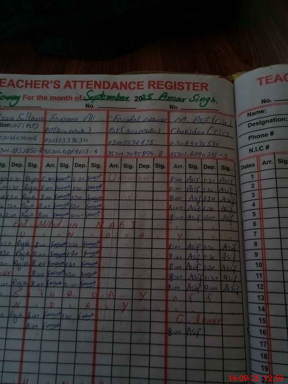| CNIC | Full Name | Designation | R/C | Absence During Last Calender Month |