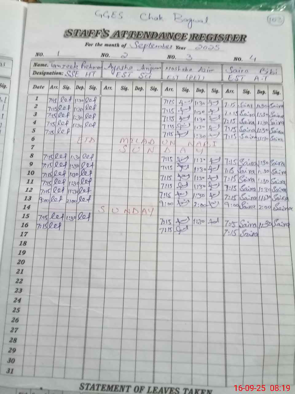 | Monitoring Date: 16-09-2025 | Start Time: 16-09-2025 07:59 AM | End Time: 16-09-2025 08:35 AM | Name of MEA: Na**** Al**** | |
