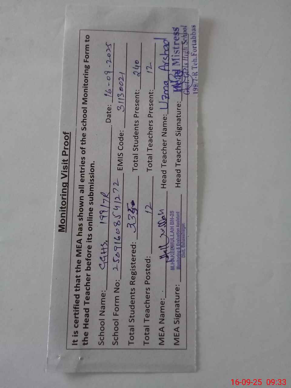 | Attendance Register | Head Teacher | MEA with School | Visit Proof |
