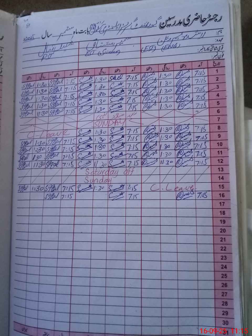 | CNIC | Full Name | Designation | R/C | Absence During Last Calender Month |