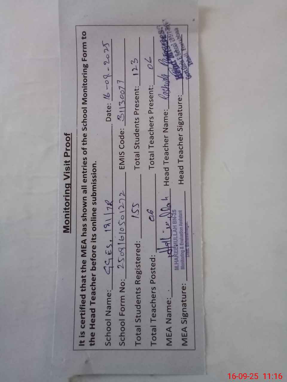 | Attendance Register | Head Teacher | MEA with School | Visit Proof |