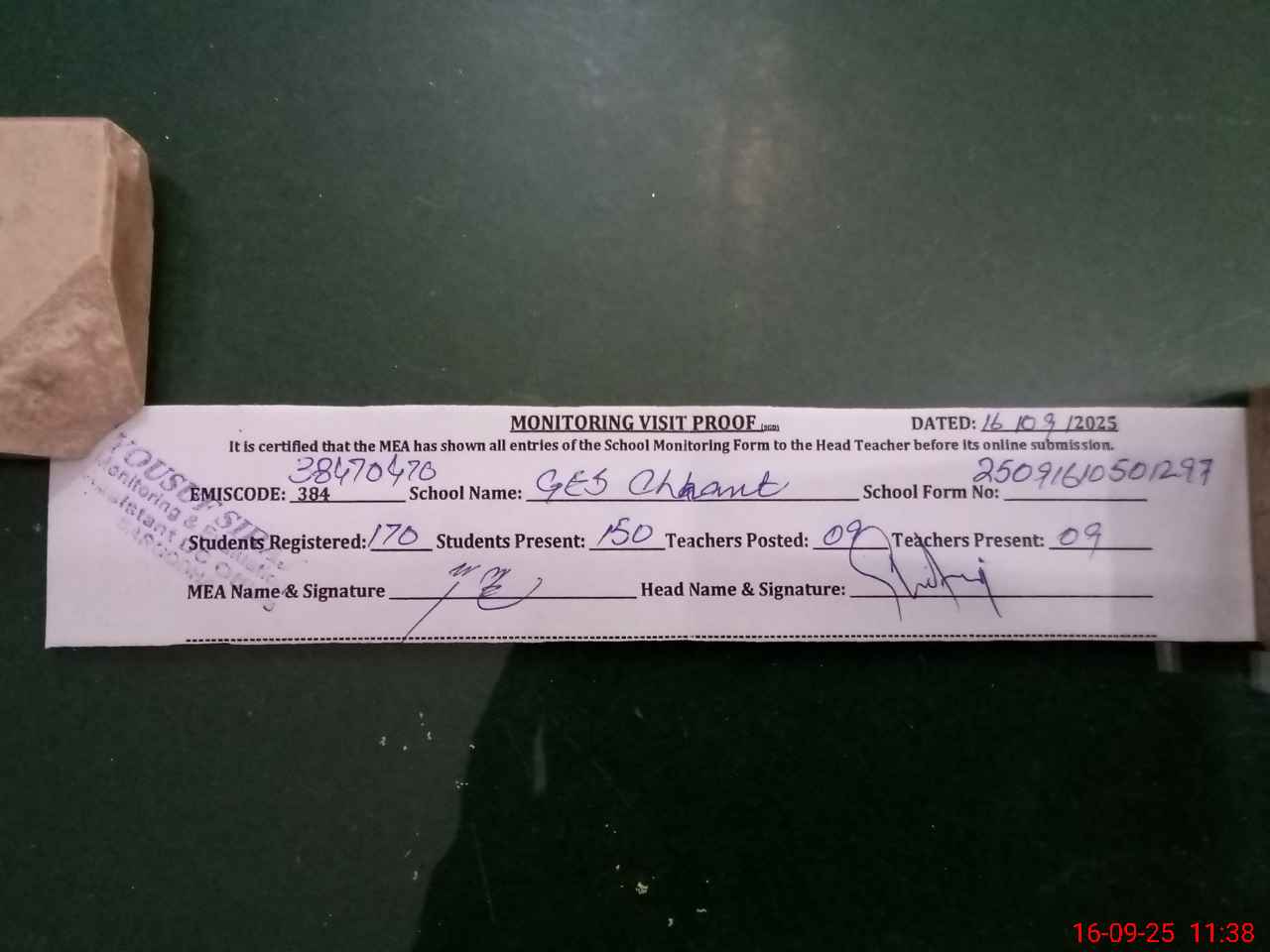 | Attendance Register | Head Teacher | MEA with School | Visit Proof |