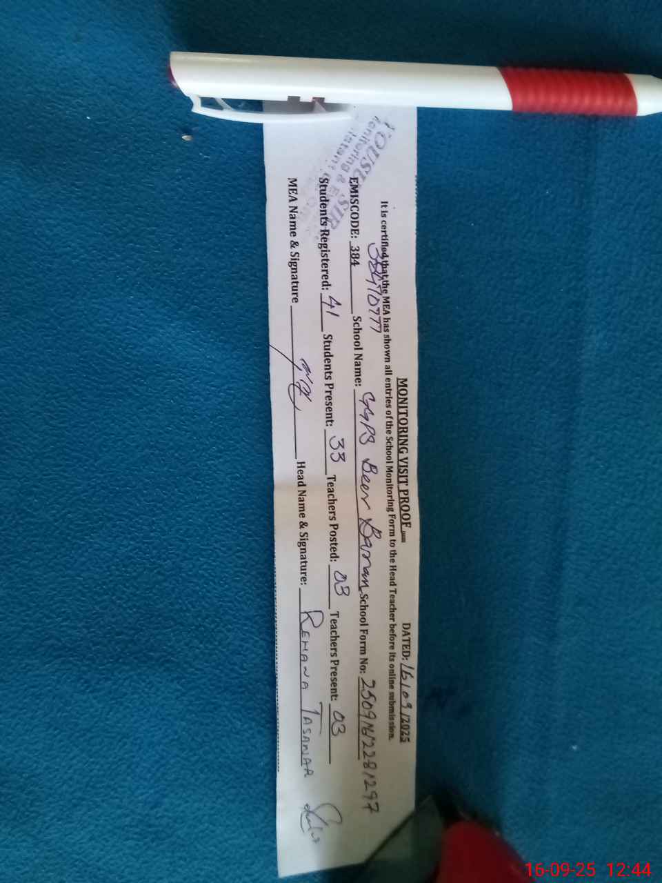 | Attendance Register | Head Teacher | MEA with School | Visit Proof |