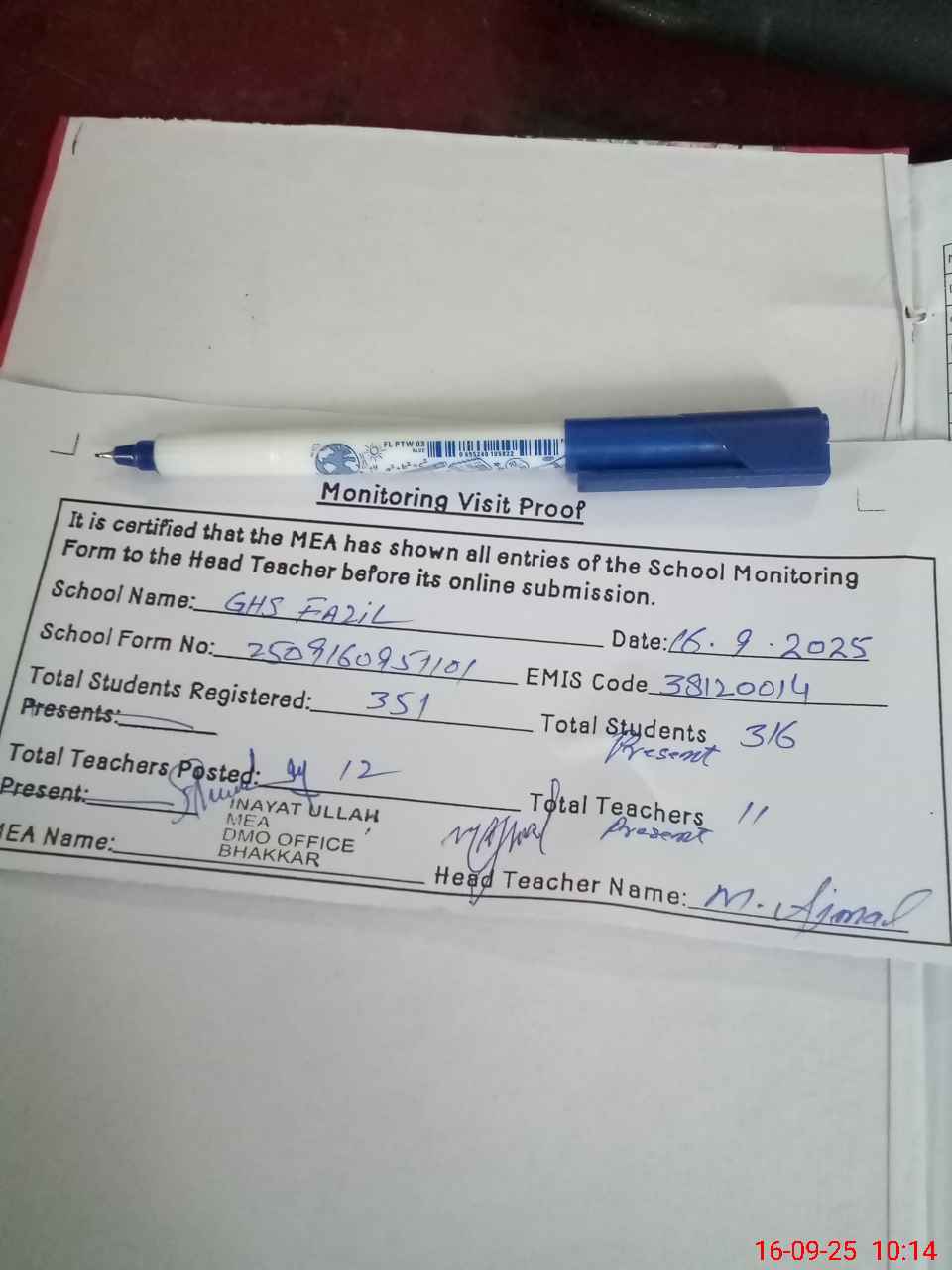 | Attendance Register | Head Teacher | MEA with School | Visit Proof |
