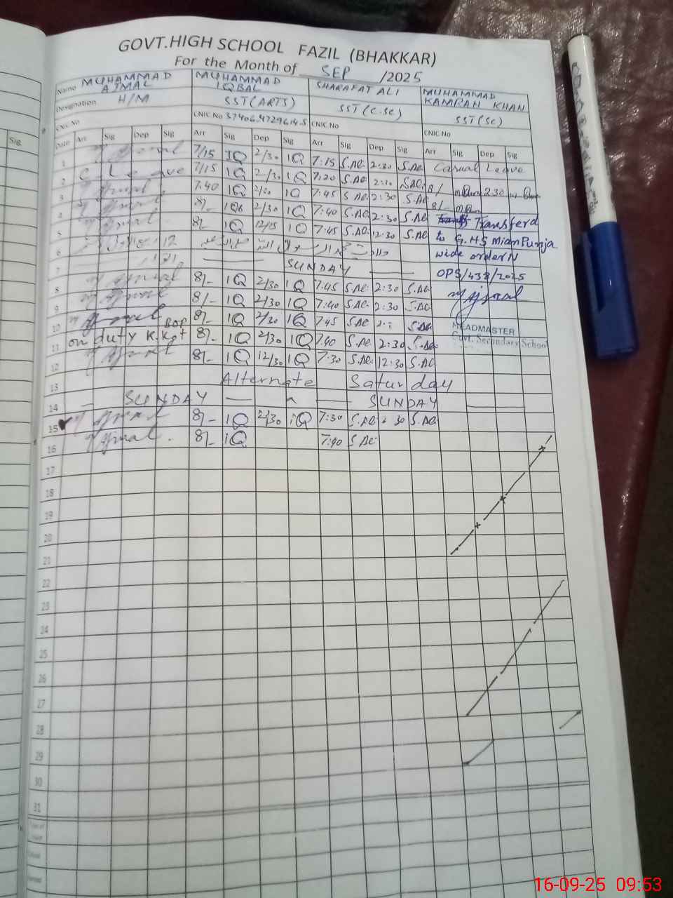 | CNIC | Full Name | Designation | R/C | Absence during last cal. month |
