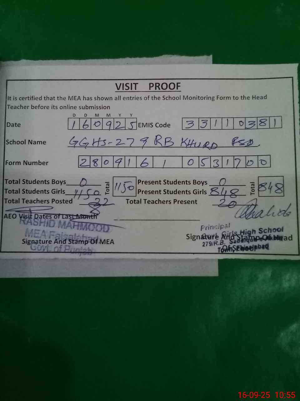 | Attendance Register | Head Teacher | MEA with School | Visit Proof |