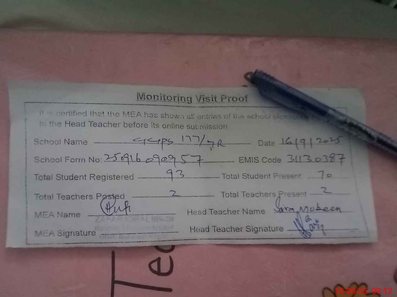 | Attendance Register | Head Teacher | MEA with School | Visit Proof |