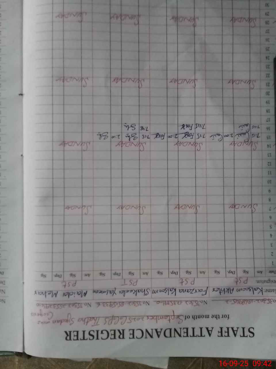 | CNIC | Full Name | Designation | R/C | Absence During Last Calender Month |