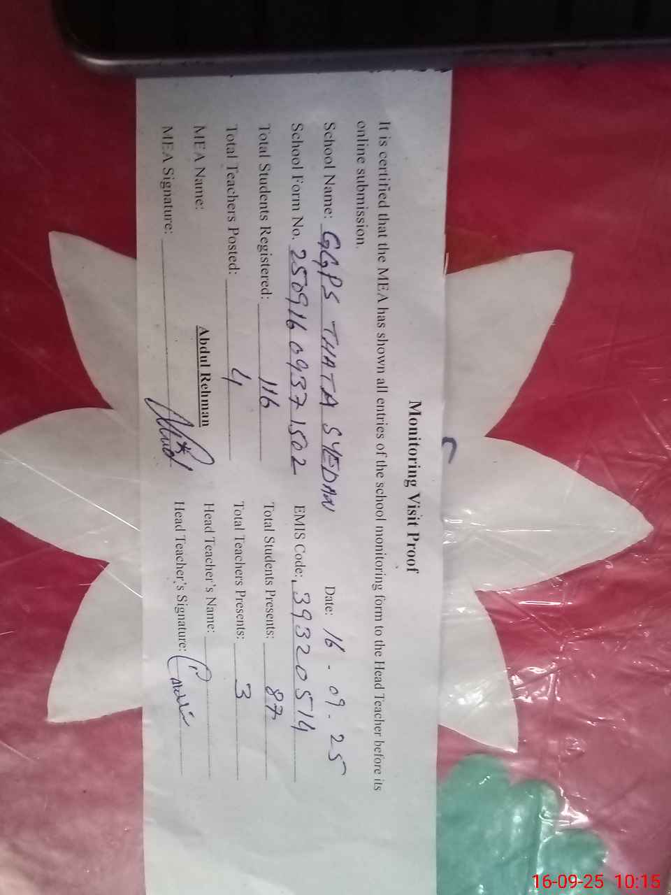 | Attendance Register | Head Teacher | MEA with School | Visit Proof |
