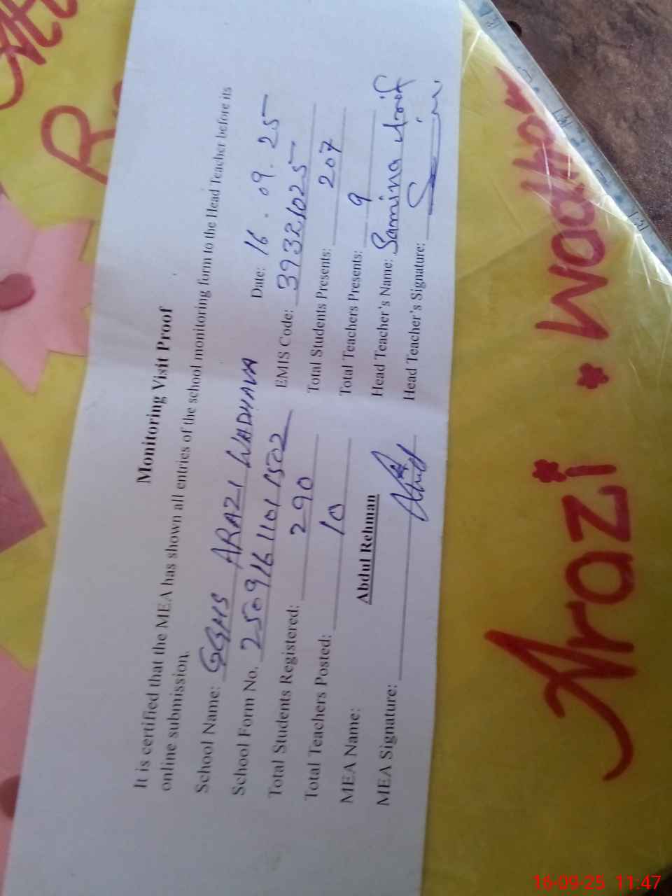 | Attendance Register | Head Teacher | MEA with School | Visit Proof |