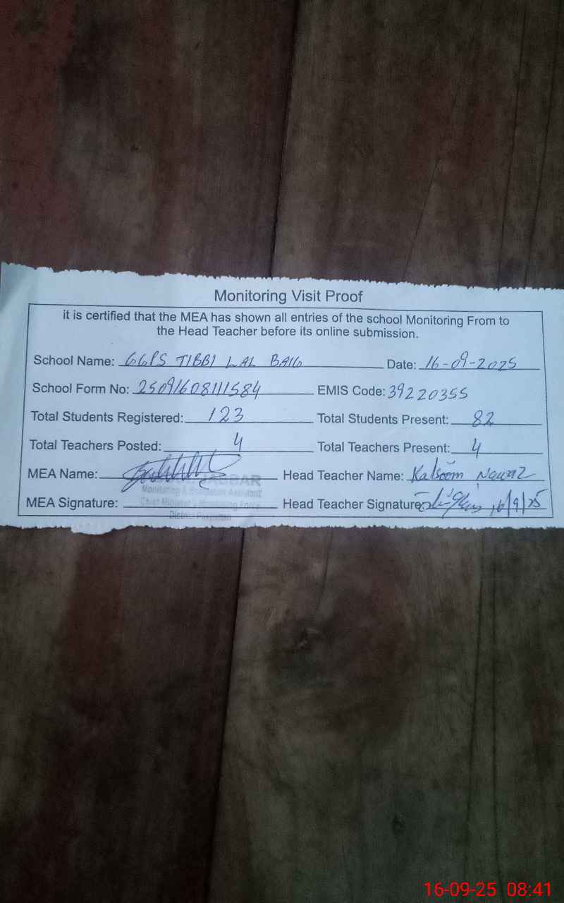 | EMIS Code: 39220355 | Name of School: GGPS TIBBI LAL BAIG | |||