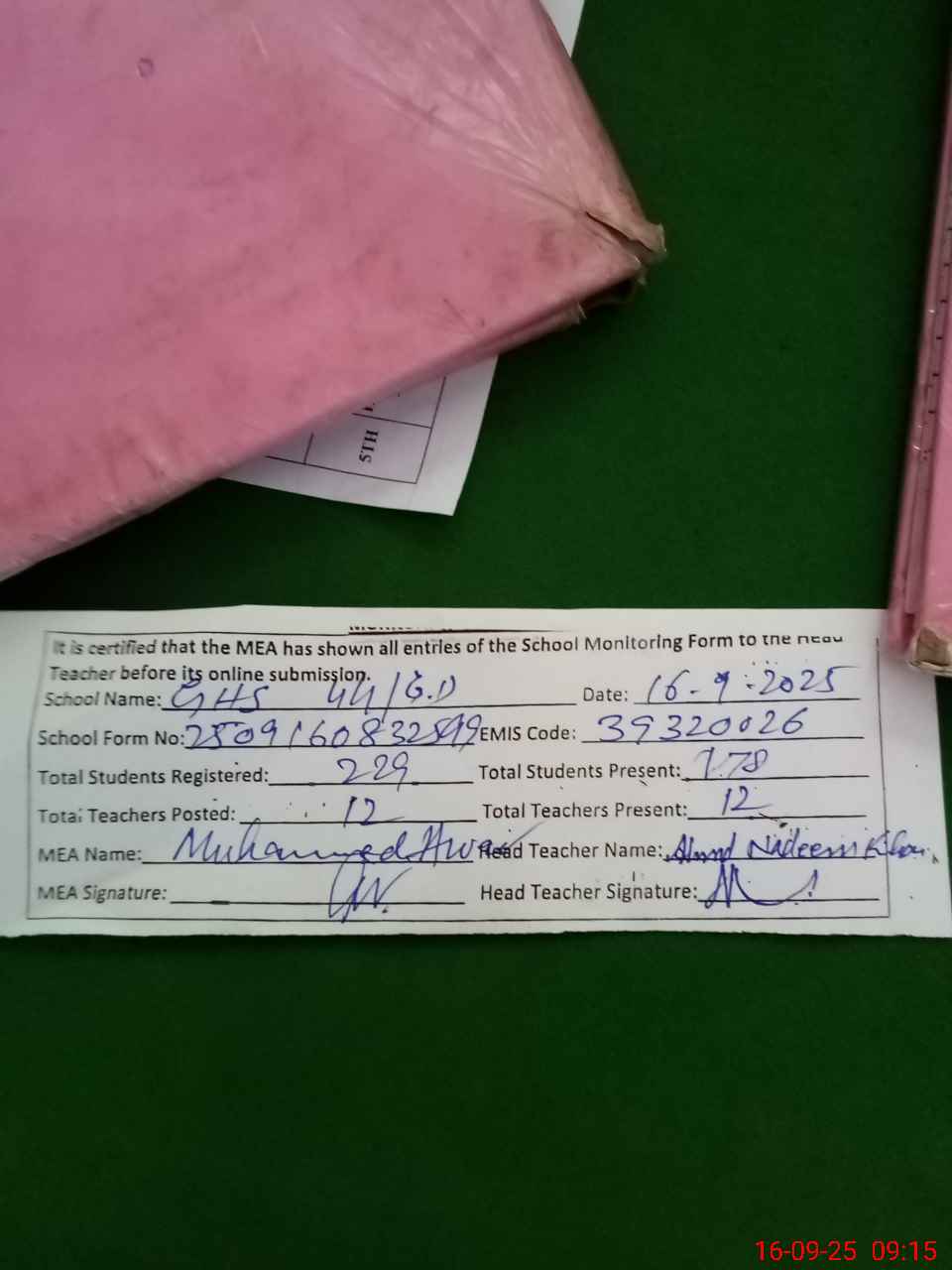 | Certified that this School was Inspected by the Undersigned MEA/DMO Today and the Information Stated Above is as Per Record. | |||||