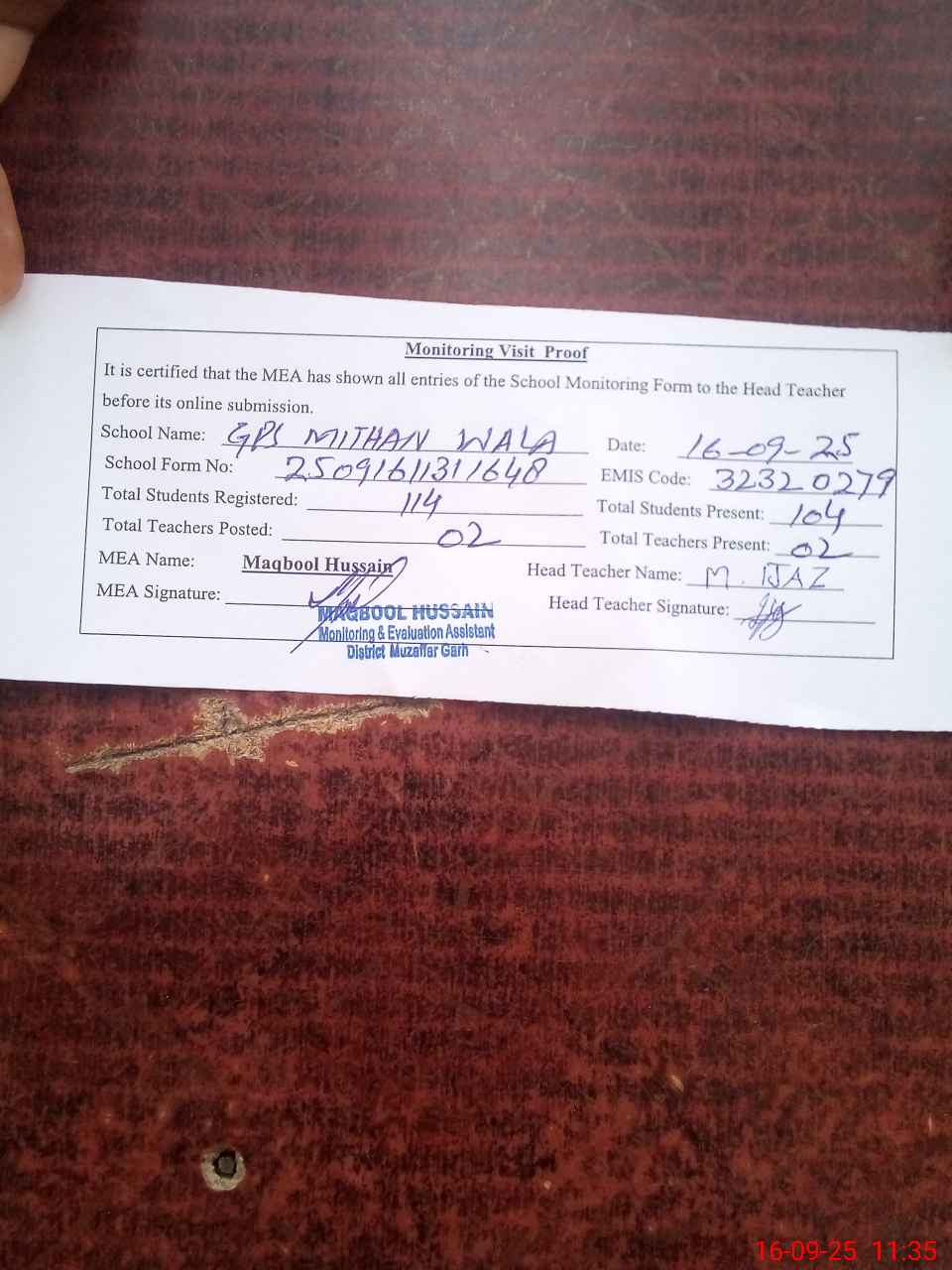 | Attendance Register | Head Teacher | MEA with School | Visit Proof |