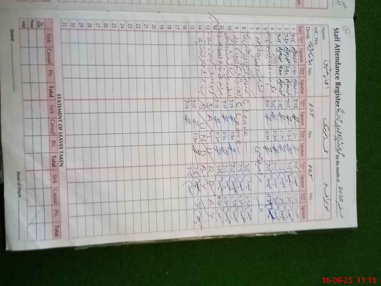 | CNIC | Full Name | Designation | R/C | Absence During Last Calender Month |