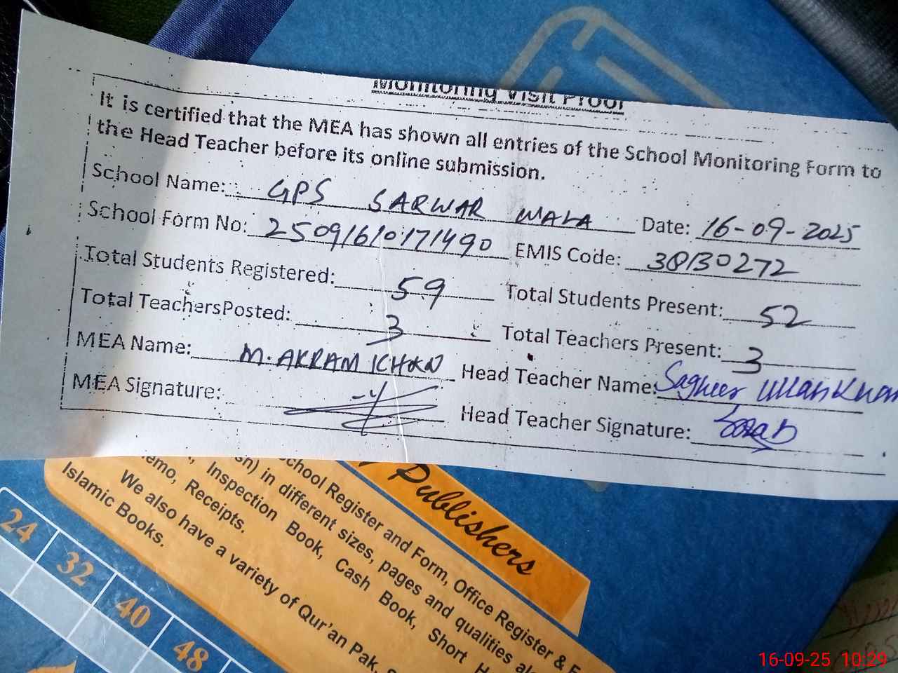 | Attendance Register | Head Teacher | MEA with School | Visit Proof |