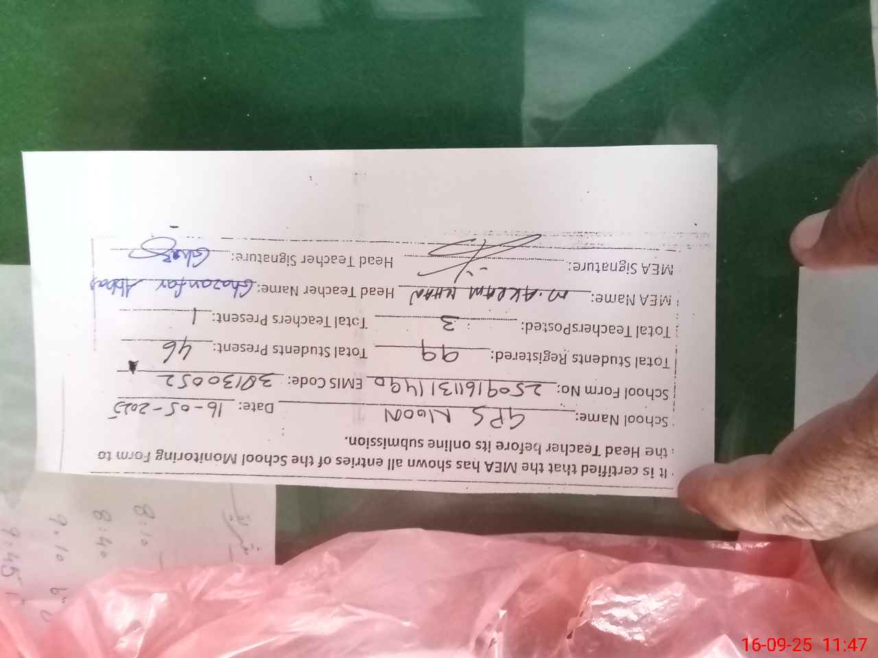 | Total no. of Classrooms: 2 No. of Classrooms Used for Teaching: 2 No. of Classrooms Storing Old Furniture, FTBs, etc: 0Comments if Any: Sir teacher Saqib Shahzad is absent from the school wef 27 January 2025 and teacher Asghar Ali is absent from the school wef 31 January 2025 however Teacher Ghanzanfar Abbas is present in the school |