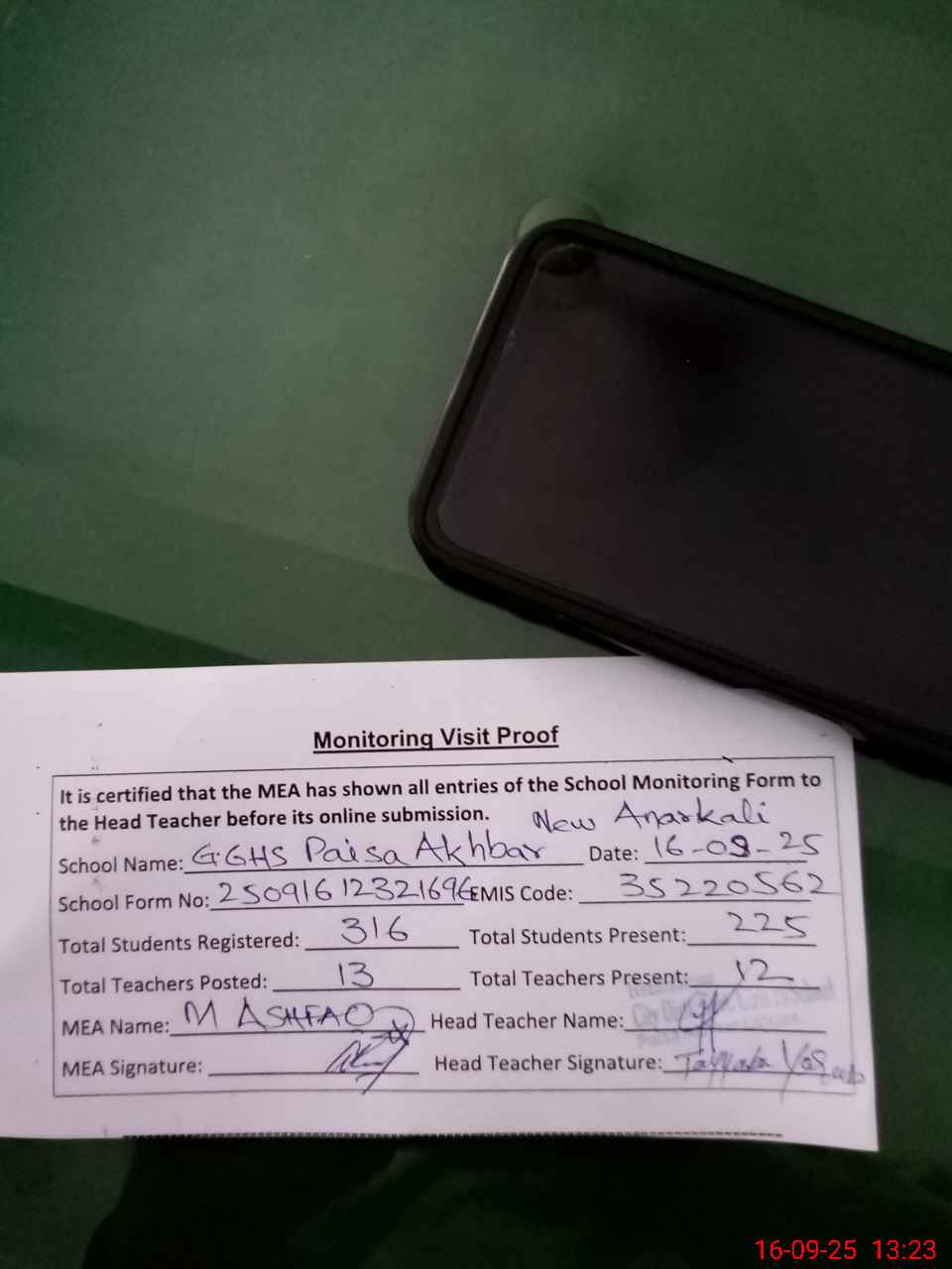 | Remarks (Use Separate Page if Required): Chowkidar Sabir Shakir long absent since 01 February 25 FTF register and bank statement not shown Council Meeting register not shown School has total 21 rooms and 07 rooms are locally dangerous while 03 classrooms in use and 04 classrooms are not in use School building is looking very old renovation work required 35220562 | |||||