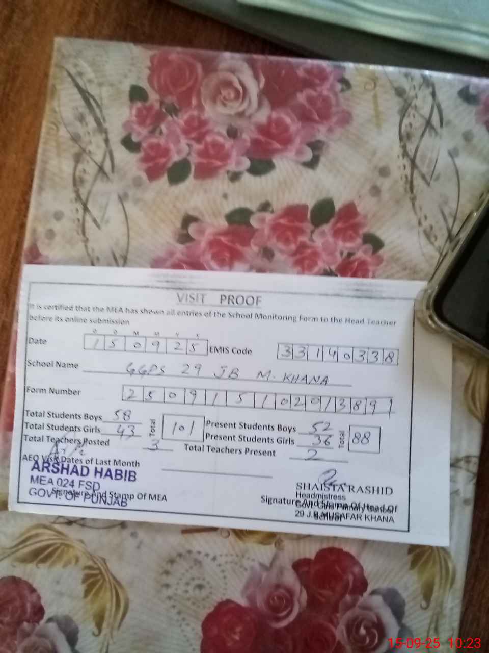 | Certified that this School was Inspected by the Undersigned MEA/DMO Today and the Information Stated Above is as Per Record. | |||||