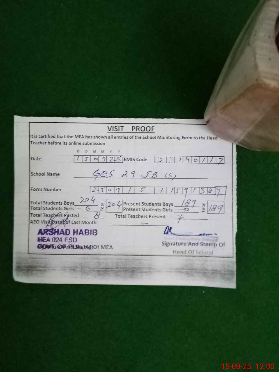 | Attendance Register | Head Teacher | MEA with School | Visit Proof |