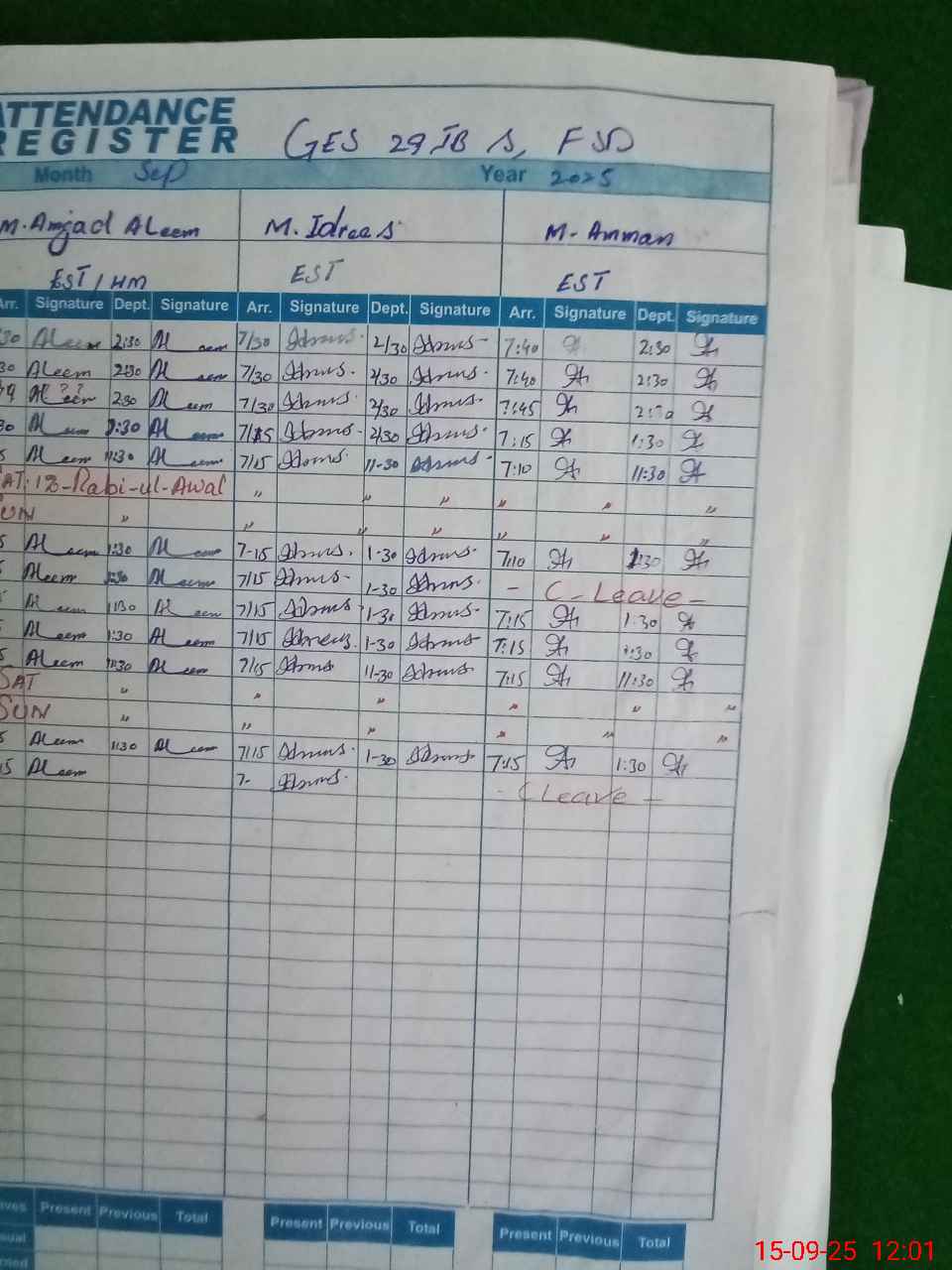 | CNIC | Full Name | Designation | R/C | Absence During Last Calender Month |