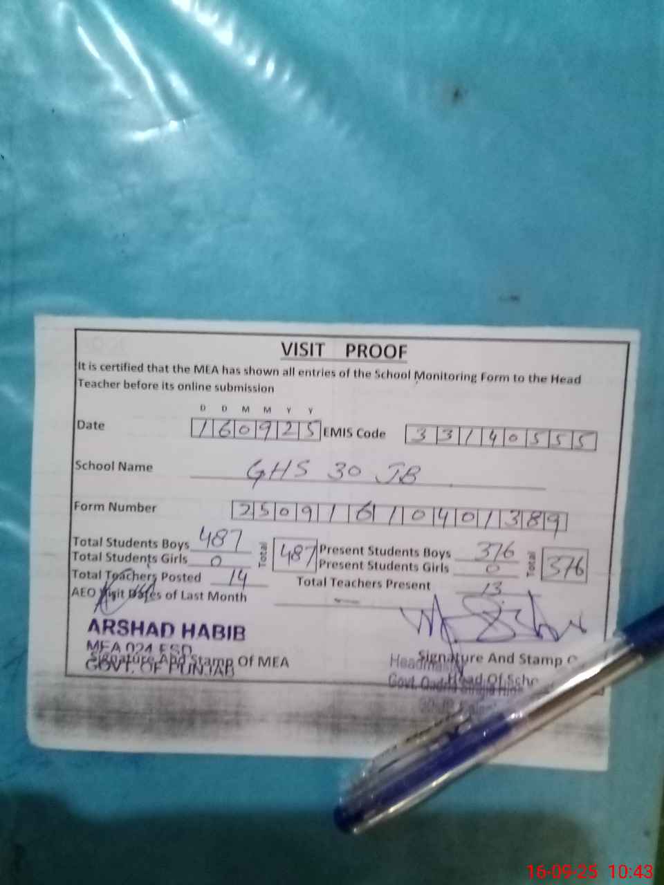 | Certified that this School was Inspected by the Undersigned MEA/DMO Today and the Information Stated Above is as Per Record. | |||||