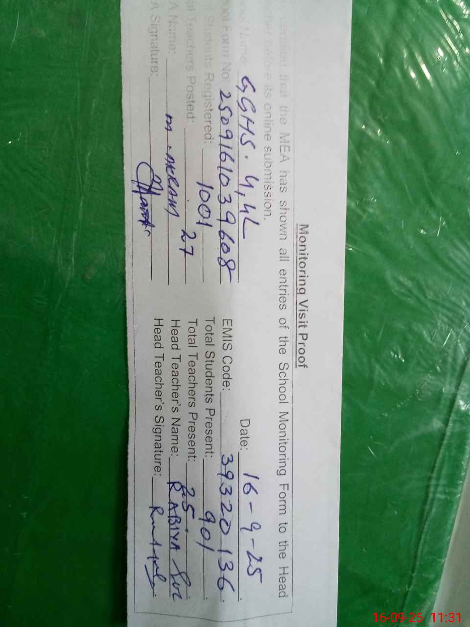 | Attendance Register | Head Teacher | MEA with School | Visit Proof |